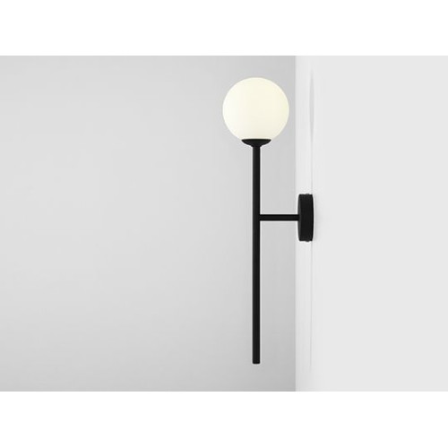 Елегантен аплик в минималистичен стил от серията Bosso, изработен от черен цвят метална основа с рамо и матово бял цвят сферична стъклена чашка на цокъл Е14. Модерно предложение за комфортно осветление на вашия хол, трапезария, спалня, хотел и заведение.