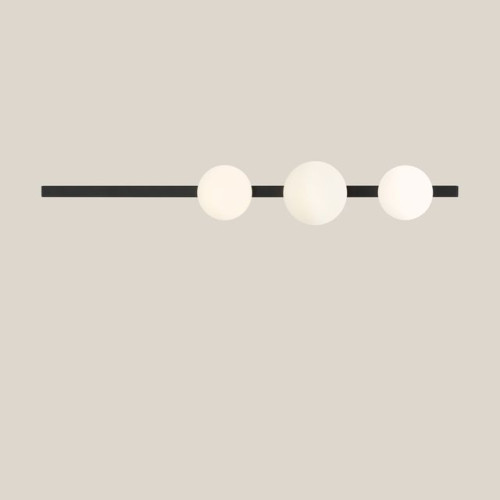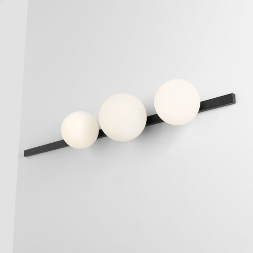 Модерен аплик с оригинален дизайн от серията Garda, изработен от черен мат цвят метална основа и три опал стъклени чашки в сферична форма. Стилно решение за комфортното и качествено осветление на вашия хол, трапезария, спалня, хотел и заведение.