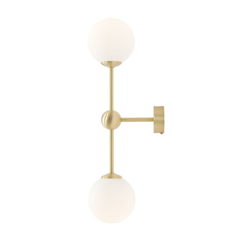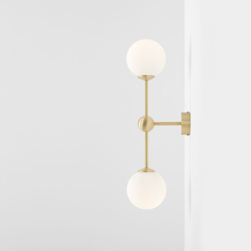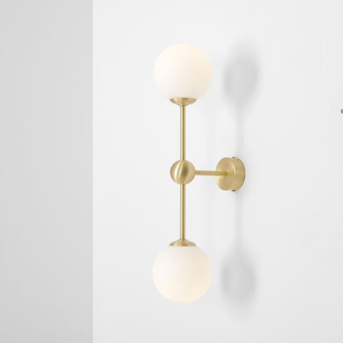 Класически аплик в модерен стил от серията Mae, изработен от кръгла основа и месингово рамо със сферичен декоративен детайл и две бели стъклени чашки на цокъл Е14. Оригинално решение за интериорното осветление на вашия хол, трапезария, спалня, хотел и заведение.
