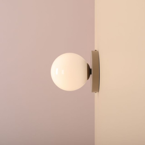Стилен аплик от серията Ball, изработен от бежов цвят кръгла метална основа и матово бял цвят стъклена чашка в сферична форма на цокъл Е14. Модерно предложение за уютното осветление на вашия хол, трапезария, спалня, коридор, хотел и заведение.