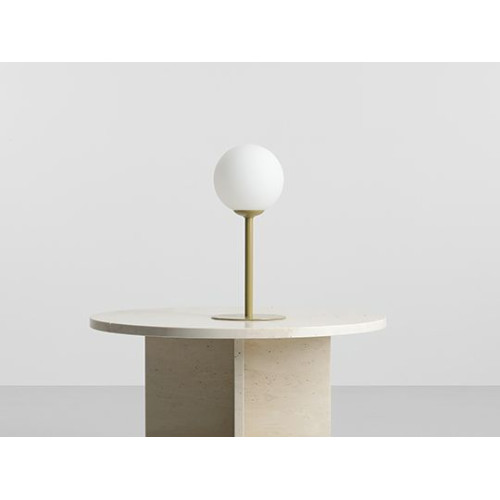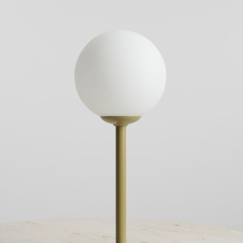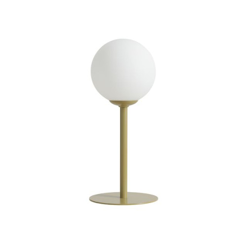Модерна настолна лампа с минималистичен дизайн от серията Pinne, изработена от цвят шам-фъстък кръгла метална основа с дълго рамо и бял цвят сферична стъклена чашка на цокъл Е14. Оригинално предложение за комфортното и стилно осветление на вашия хол, трапезария, спалня, офис, хотел и заведение.