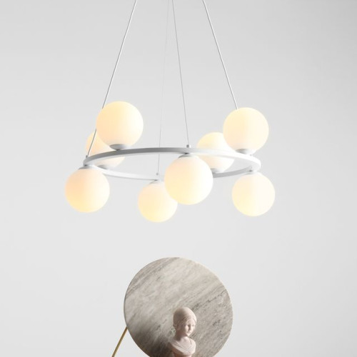 Оригинален пендел със стилен дизайн от серията Krone, изработен от бял мат цвят метална основа и висящ метален ринг с осем матово бели стъклени чашки в сферична форма на цокъл Е14. Модерно предложение за комфортното и качествено осветление на вашия хол, трапезария, спалня, хотел и заведение.