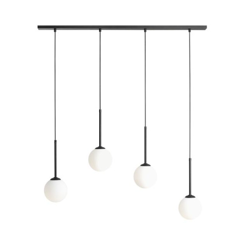 Елегантен пендел в минималистичен стил от серията Bosso, изработен от черен цвят правоъгълна метална основа и висящи цилиндрични метални елементи с четири матово бял цвят сферични стъклени чашки на цокъл Е14. Модерно предложение за комфортно осветление на вашия хол, трапезария, хотел и заведение.