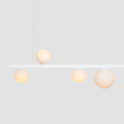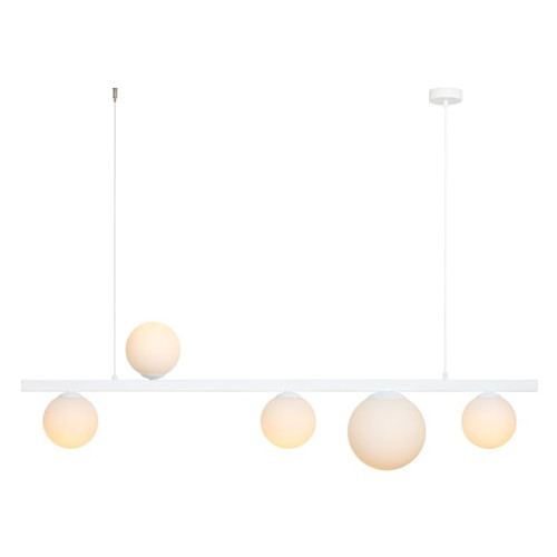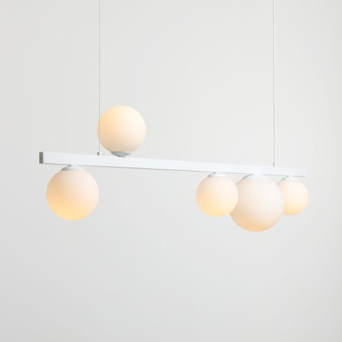Модерен пендел с оригинален дизайн от серията Garda, изработен от бял мат цвят метална основа и висящо метално рамо с пет асиметрично разположени опал стъклени чашки в сферична форма. Стилно решение за комфортното и качествено осветление на вашия хол, трапезария, спалня, хотел и заведение.