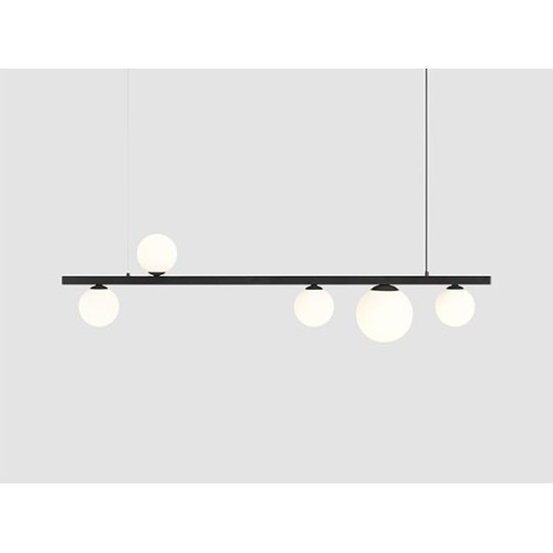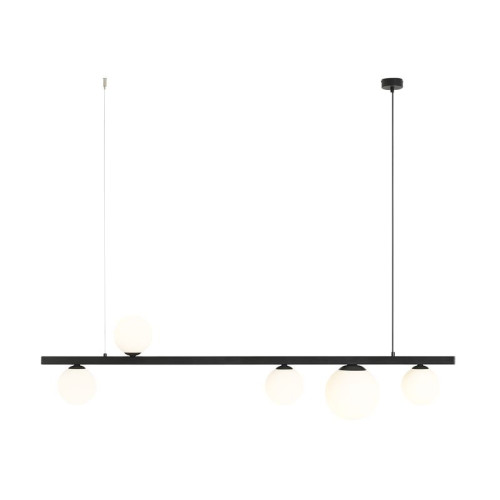 Модерен пендел с оригинален дизайн от серията Garda, изработен от черен мат цвят метална основа и висящо метално рамо с пет асиметрично разположени опал стъклени чашки в сферична форма. Стилно решение за комфортното и качествено осветление на вашия хол, трапезария, спалня, хотел и заведение.