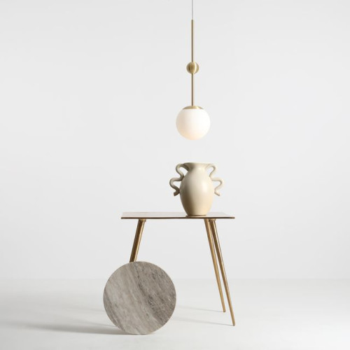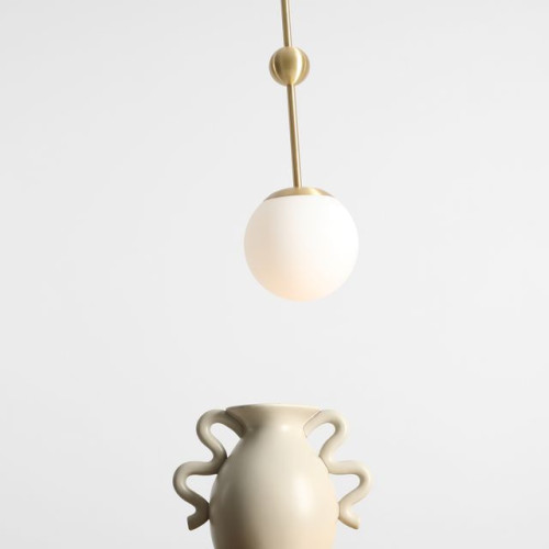 Класически пендел в модерен стил от серията Mae, изработен от кръгла основа и висящо месингово тяло със сферичен декоративен детайл и бяла стъклена чашка на цокъл Е27. Оригинално решение за интериорното осветление на вашия хол, трапезария, спалня, хотел и заведение.