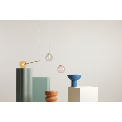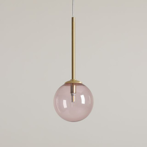 Елегантен пендел в минималистичен стил от серията Bosso, изработен от цвят месинг метална основа и розов цвят сферична стъклена чашка на цокъл Е14. Модерно предложение за комфортно осветление на вашия хол, трапезария, спалня, хотел и заведение.