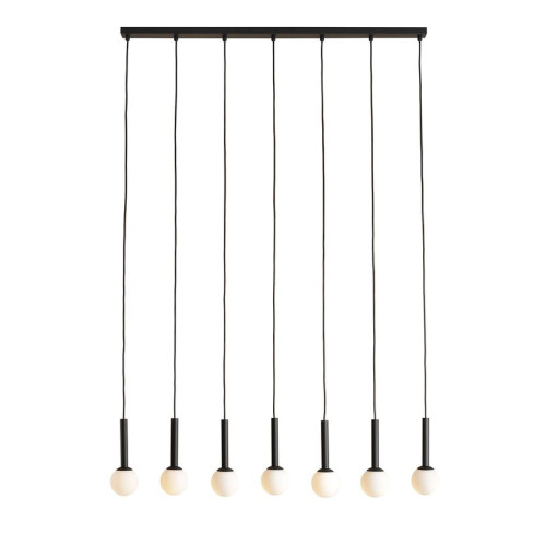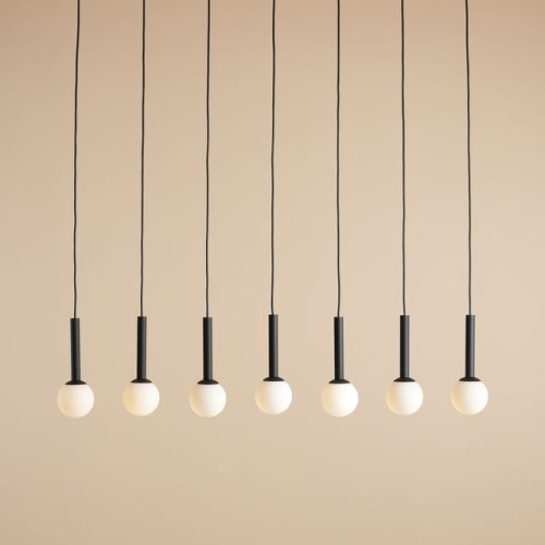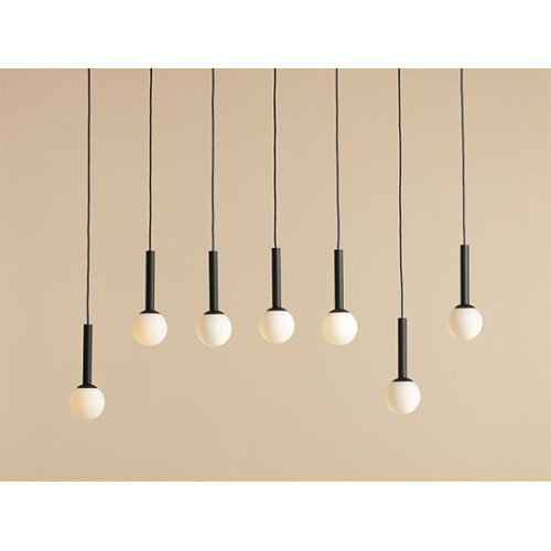 Стилен пендел от серията Riu, изработен от черна правоъгълна метална основа и цилиндрични метални елементи с матово бял цвят сферични стъклени чашки на цокъл G9. Модерно предложение за комфортно осветление на вашия хол, трапезария, спалня, хотел и заведение.