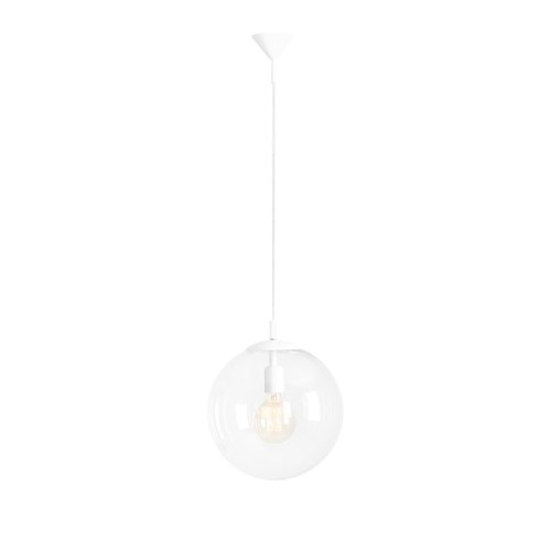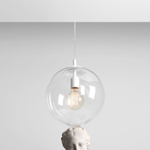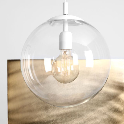Стилен пендел с модерен дизайн от серията Globe, изработен от бял цвят метална основа и сферична форма прозрачен стъклен разсейвател на цокъл Е27. Качествена висяща лампа, подходяща за комфортното и стилно осветление на вашия хол, трапезария, спалня, хотел и заведение.