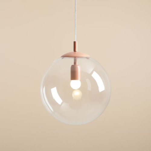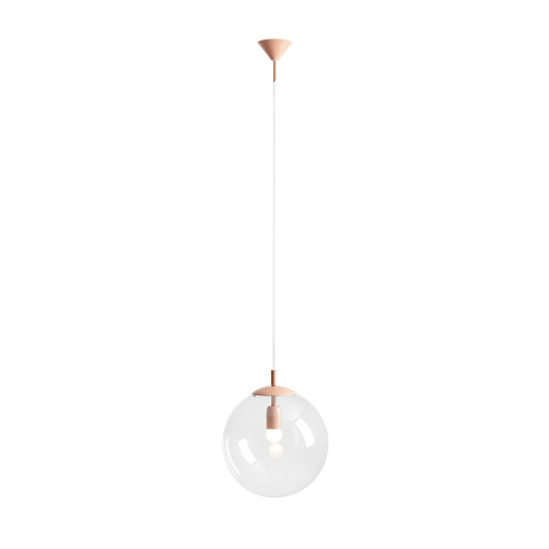 Стилен пендел с модерен дизайн от серията Globe, изработен от цвят корал метална основа и сферична форма прозрачен стъклен разсейвател на цокъл Е27. Качествена висяща лампа, подходяща за комфортното и стилно осветление на вашия хол, трапезария, спалня, хотел и заведение.