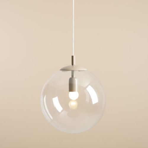 Стилен пендел с модерен дизайн от серията Globe, изработен от бежов цвят метална основа и сферична форма прозрачен стъклен разсейвател на цокъл Е27. Качествена висяща лампа, подходяща за комфортното и стилно осветление на вашия хол, трапезария, спалня, хотел и заведение.