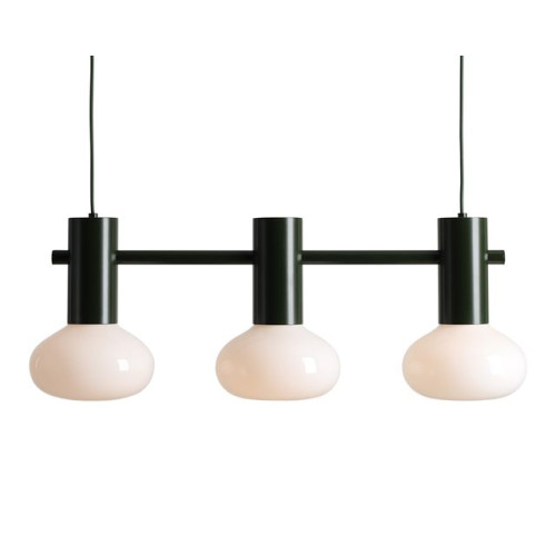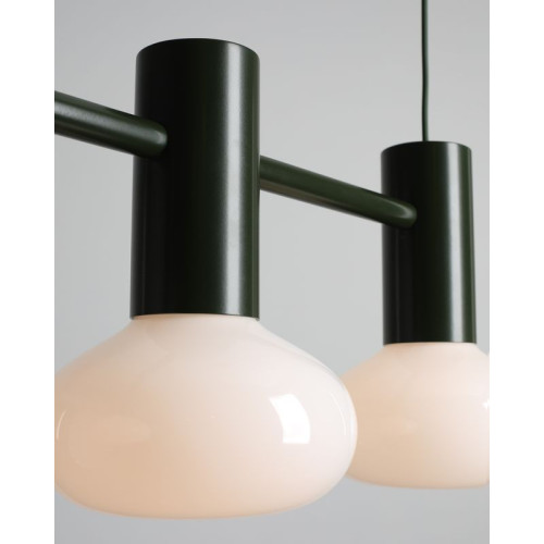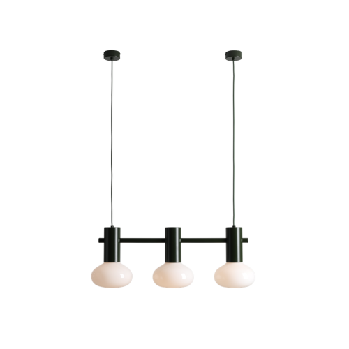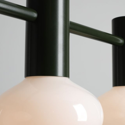 Стилен пендел с минималистичен дизайн от серията Flo, изработен от тъмно зелен цвят метално тяло и три опал стъклени чашки на цокъл Е14. Оригинално решение за комфортното и модерно осветление на вашия хол, трапезария, спалня, хотел и заведение.