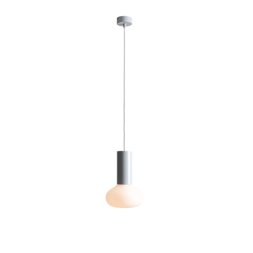 Стилен пендел с минималистичен дизайн от серията Flo, изработен от сив цвят цилиндрична метална основа и опал стъклена чашка на цокъл Е14. Оригинално решение за комфортното и модерно осветление на вашия хол, трапезария, спалня, хотел и заведение.