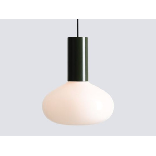 Стилен пендел с минималистичен дизайн от серията Flo, изработен от тъмно зелен цвят цилиндрична метална основа и опал стъклена чашка на цокъл Е14. Оригинално решение за комфортното и модерно осветление на вашия хол, трапезария, спалня, хотел и заведение.