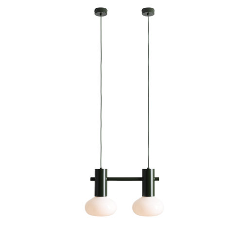 Стилен пендел с минималистичен дизайн от серията Flo, изработен от тъмно зелен цвят метално тяло и две опал стъклени чашки на цокъл Е14. Оригинално решение за комфортното и модерно осветление на вашия хол, трапезария, спалня, хотел и заведение.