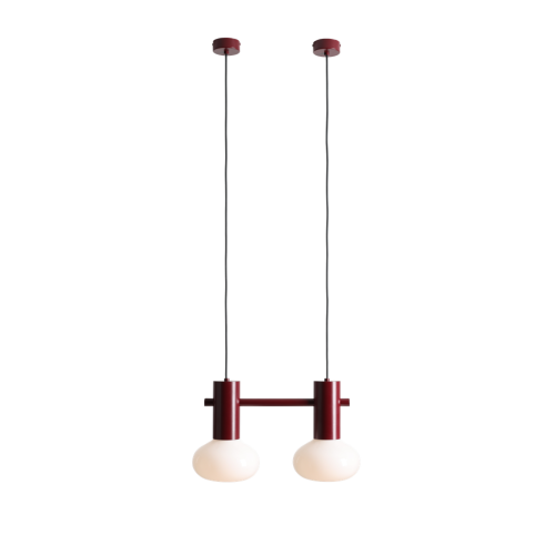 Стилен пендел с минималистичен дизайн от серията Flo, изработен от червен цвят метално тяло и две опал стъклени чашки на цокъл Е14. Оригинално решение за комфортното и модерно осветление на вашия хол, трапезария, спалня, хотел и заведение.