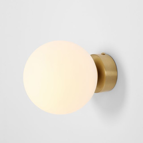 Стилен аплик от серията Ball, изработен от цвят месинг кръгла метална основа и матово бял цвят стъкл..