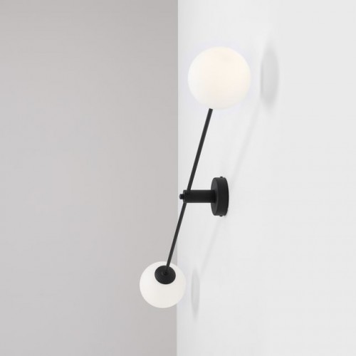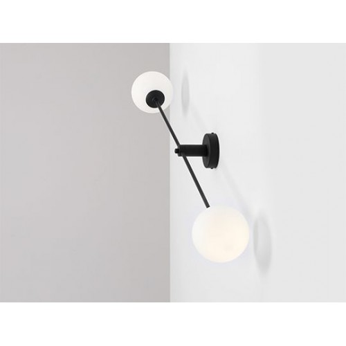 Модерен аплик с елегантен дизайн от серията Ohio, изработен от цвят черен мат метална основа и регулируемо рамо с две бял мат сферични стъклени чашки на цокъл Е14. Чудесно предложение за комфортното осветление на вашия хол, трапезария, спалня, хотел и заведение.