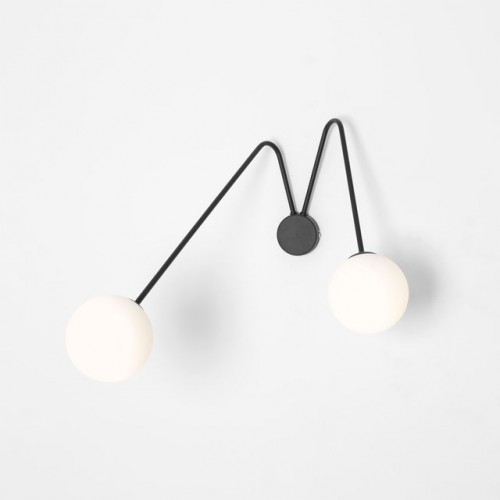 Елегантен аплик от серията Holm, изработен от черен мат метална основа с две рамена и бял мат сферич..