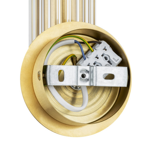 Съвременен аплик от серията Hampton, изработен от месингова основа с рамо и набраздена прозрачна стъклена чашка в цилиндрична форма. Стилно предложение за интериорното осветление на вашия хол, трапезария, спалня, коридор, хотел и ресторант.