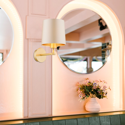 Класически аплик със стилен дизайн от серията Princeton, изработен от месингова основа с право рамо и текстилна шапка в бежов цвят отвън и златист във вътрешността. Великолепна лампа, подходяща комфортното и изискано осветление на вашия хол, трапезария, спалня, фоайе, хотел и заведение.