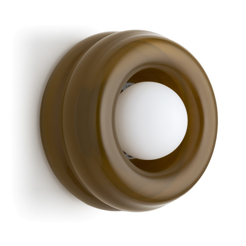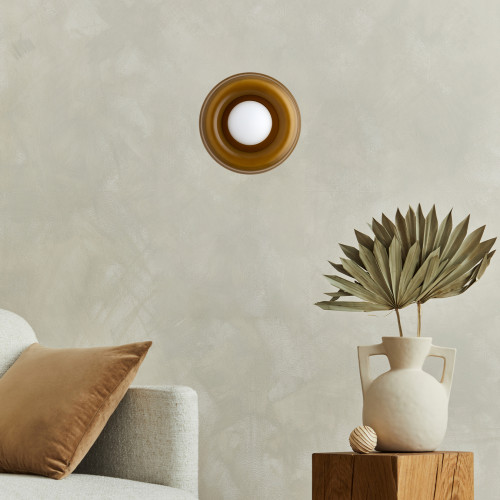 Оригинален аплик със стилен дизайн от серията Tevo, изработен от цвят кехлибар стъклено тяло и опал мат стъклена чашка в сферична форма на цокъл G9. Модерно предложение за комфортното осветление на вашия хол, трапезария, спалня, коридор, хотел и заведение.