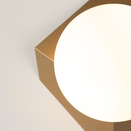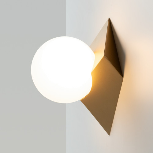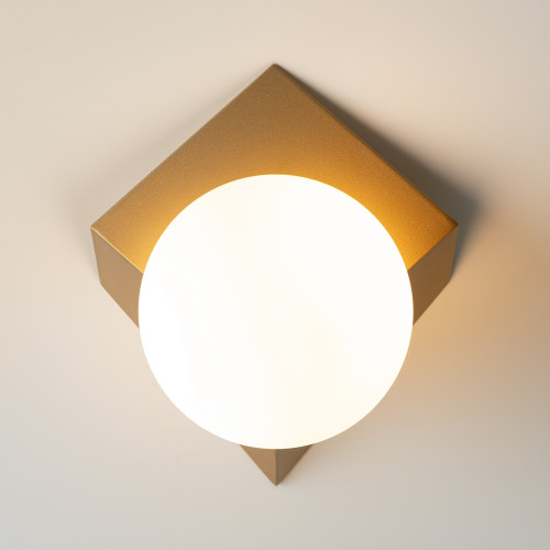 Оригинален аплик с минималистичен дизайн от серията Cubeo, изработен от цвят месинг многоъгълна метална основа и сферична форма бяла стъклена чашка на цокъл G9. Модерно решение за интериорното осветление на вашия хол, трапезария, спалня, коридор, хотел и заведение.