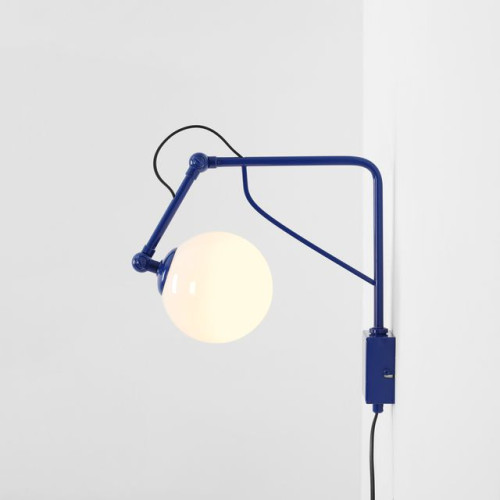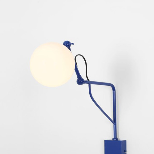 Стилен аплик с функционален дизайн от серията Soho Glass, изработен от син цвят метална основа с регулируемо рамо и бял мат сферична стъклена чашка на цокъл Е14. Модерна лампа със захранващ кабел с щепсел и вграден ключ: ON/OFF, подходяща за комфортното и стилно осветление на вашия хол, трапезария, спалня, хотел и заведение.