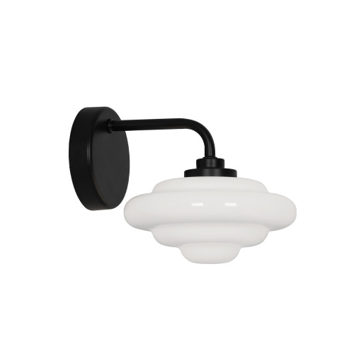 Стилен аплик с модерен дизайн от серията Elsa, изработен от черен цвят метална основа с рамо и опал стъклена чашка с атрактивна форма. Оригинална лампа, подходяща за комфортното осветление на вашия хол, трапезария, спалня, хотел и заведение.