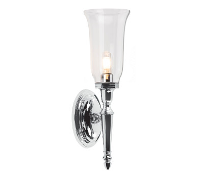 Качествен аплик с изискан дизайн, ръчно изработен от масивен месинг кръгла основа с рамо в цвят полиран хром и прозрачна стъклена чашка. Стилна лампа с висока степен на влагозащита: IP44, която ще изпълни с класическа атмосфера и уютна светлина вашата модерна или традиционна баня.