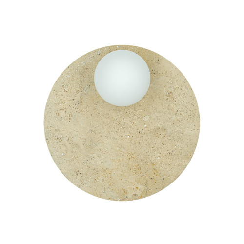 Модерен аплик с оригинален дизайн, изработен от метална основа с декоративна кръгла плоча от естествен камък и опал стъклена чашка в сферична форма. Стилна лампа, подходяща за уютното осветление на вашия хол, трапезария, спалня, коридор, хотел и заведение.