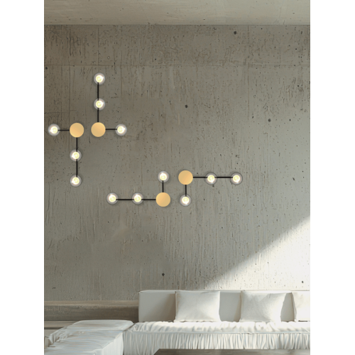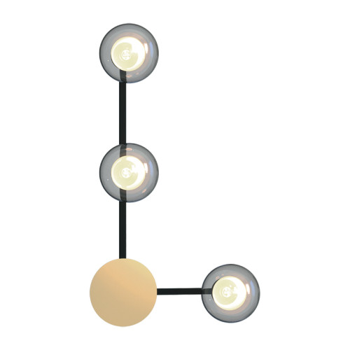 Атрактивен аплик със съвременен дизайн, изработен от цвят златист мат кръгла метална основа с черни рамена и три опушени стъклени чашки с опал стъклени разсейватели на цокъл G9. Лампа, която ще изпълни с уникална атмосфера и стил вашия хол, спалня, коридор, офис, хотел и заведение.