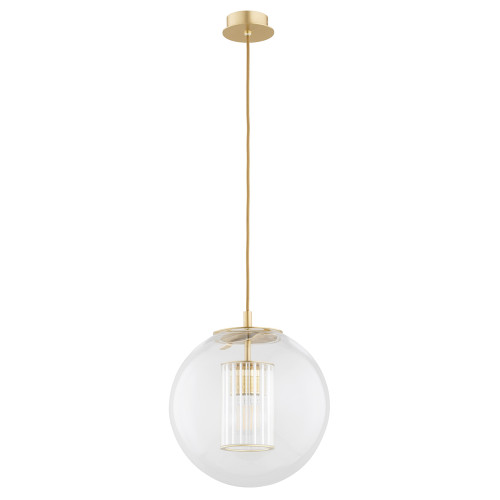 Съвременен пендел от серията Hampton, изработен от месингова основа и набразден прозрачен стъклен разсейвател в цилиндрична форма, покрит от сферична прозрачна стъклена чашка. Стилно предложение за интериорното осветление на вашия хол, трапезария, хотел и ресторант.