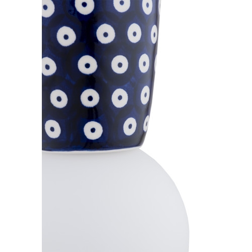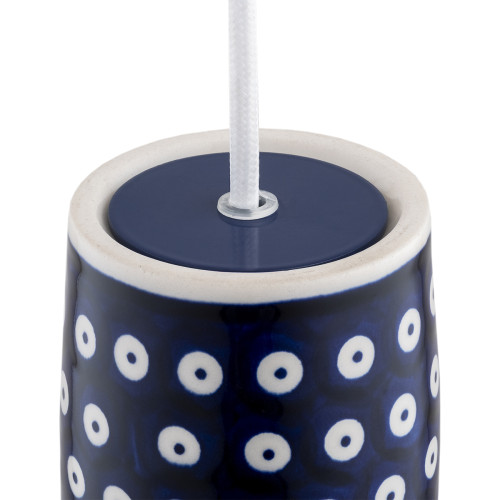 Оригинален пендел със стилен дизайн от серията Boll, изработен от метална основа и красиво керамично тяло в тъмно син цвят с ръчно декорирани бели детайли и опал мат сферичен стъклен разсейвател. Атрактивно решение за уютното и комфортно осветление на вашия хол, трапезария, спалня, хотел и заведение.