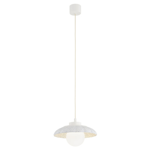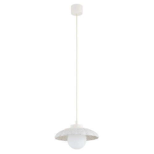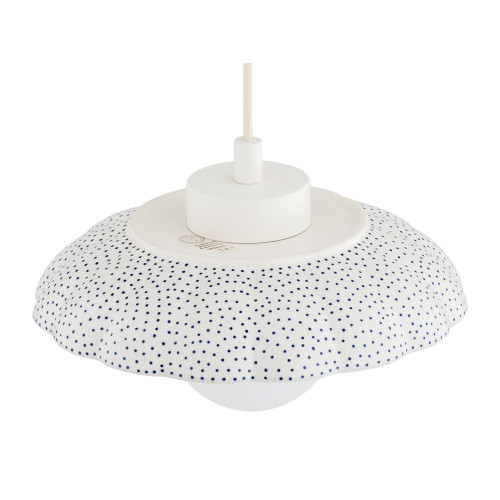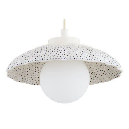 Оригинален пендел със стилен дизайн от серията Boll, изработен от метална основа и красива керамична шапка в кремав цвят с ръчно декорирани тъмно сини детайли и опал мат сферичен стъклен разсейвател. Атрактивно решение за уютното и комфортно осветление на вашия хол, трапезария, спалня, хотел и заведение.