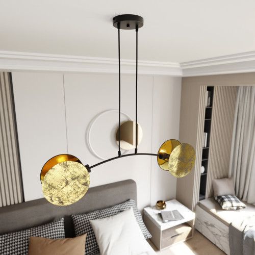 Оригинален пендел със стилен дизайн от серията Motif, изработен от черен цвят метална основа с тънко извито рамо и две двойки декоративни текстилни диска в златиста мраморна шарка, разположени около източниците на светлина. Модерно решение за интериорното осветление във вашия хол, трапезария, спалня, хотел и заведение.
