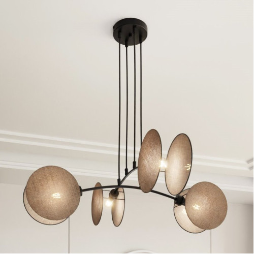 Оригинален пендел със стилен дизайн от серията Motif, изработен от черен цвят метална основа с тънки извити рамена и четири двойки декоративни текстилни диска в бежов цвят, разположени около източниците на светлина. Модерно решение за интериорното осветление във вашия хол, трапезария, спалня, хотел и заведение.
