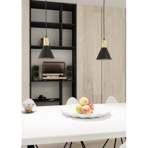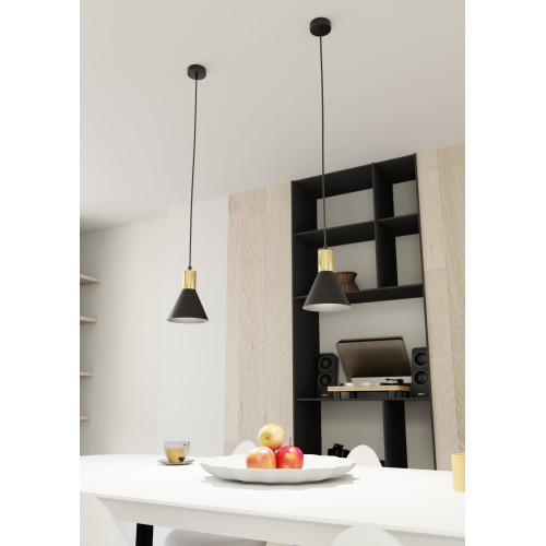Модерен пендел в стил лофт от серията Rosa, изработен от черен цвят кръгла метална основа и черна метална чашка в конусовидна форма със златист декоративен детайл. Стилно предложение за интериорното осветление във вашия хол, трапезария, спалня, хотел и ресторант.