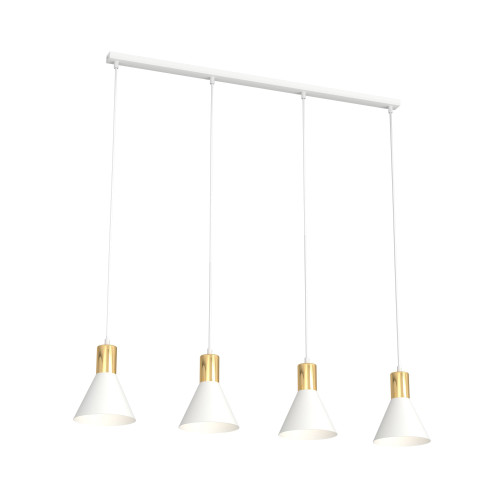 Модерен пендел в стил лофт от серията Rosa, изработен от бял цвят правоъгълна метална основа и четири бели метални чашки в конусовидна форма със златисти декоративни детайли. Стилно предложение за интериорното осветление във вашия хол, трапезария, спалня, хотел и ресторант.