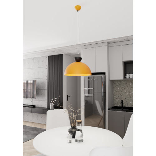 Модерен пендел със стилен дизайн от серията Lunaro, изработен от оранжев цвят метална основа и полусферична оранжева метална шапка с черен декоративен елемент отгоре. Качествена висяща лампа, подходяща за интериорното осветление на вашия хол, трапезария, спалня, хотел и ресторант.