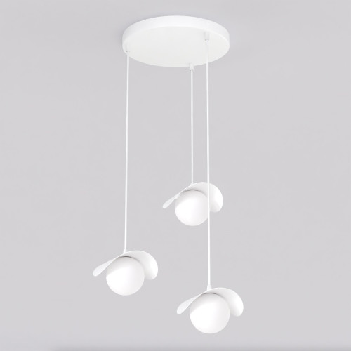Модерен пендел с минималистичен дизайн от серията Ritual, изработен от бял цвят метална основа и три извити метални чашки с опал стъклени сферични разсейватели. Оригинално решение за интериорното осветление на вашия хол, трапезария, хотел и ресторант.