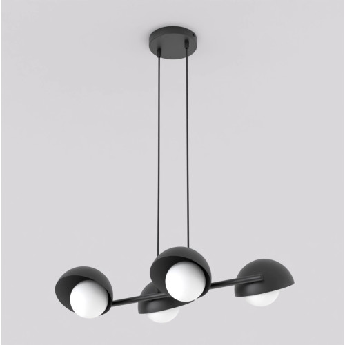 Стилен пендел с оригинален дизайн от серията Boom, изработен от черен цвят метална основа и четири полусферични метални чашки с опал стъклени разсейватели. Съвременна дизайнерска лампа, подходяща за интериорното осветление на вашия хол, трапезария, хотел и ресторант.