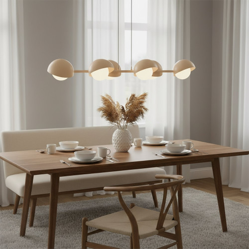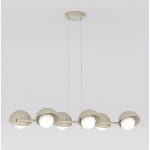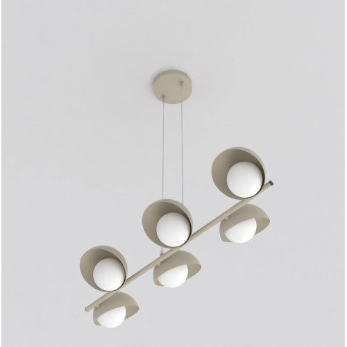 Стилен пендел с оригинален дизайн от серията Boom, изработен от бежов цвят метална основа и шест полусферични метални чашки с опал стъклени разсейватели. Съвременна дизайнерска лампа, подходяща за интериорното осветление на вашия хол, трапезария, хотел и ресторант.