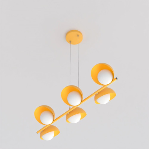 Стилен пендел с оригинален дизайн от серията Boom, изработен от оранжев цвят метална основа и шест полусферични метални чашки с опал стъклени разсейватели. Съвременна дизайнерска лампа, подходяща за интериорното осветление на вашия хол, трапезария, хотел и ресторант.