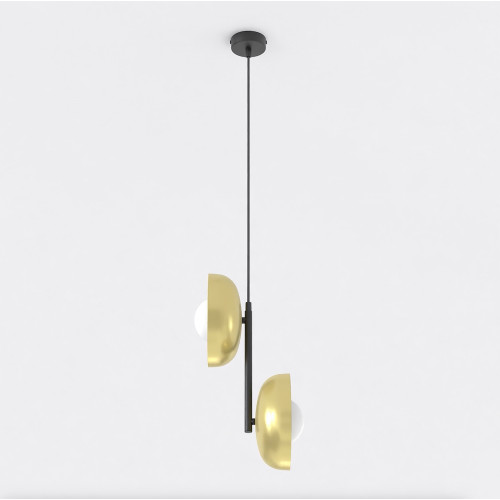 Оригинален пендел със стилен дизайн от серията Vanila, изработен от кръгла метална основа с черен цвят вертикално висящо метално рамо и две полусферични метални шапки в матово златист цвят с опал стъклени сферични разсейватели. Модерно решение за комфортното осветление във вашия хол, трапезария, спалня, хотел и заведение.