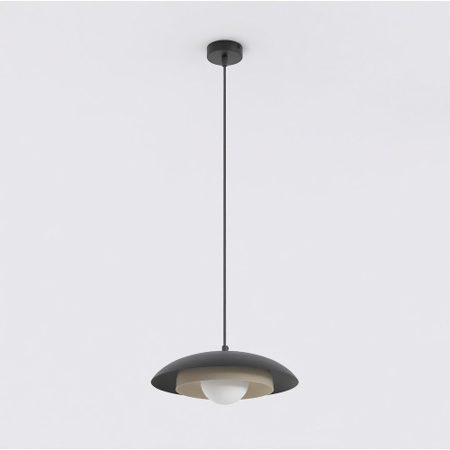 Модерен пендел в скандинавски стил от серията Skin, изработен от черен цвят кръгла метална основа и полусферична форма двойна метална шапка в черен и бежов цвят и опал стъклен сферичен разсейвател. Оригинална висяща лампа, подходяща за интериорното осветление на вашия хол, трапезария, хотел и ресторант.