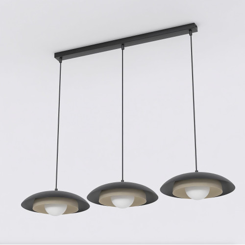 Модерен пендел в скандинавски стил от серията Skin, изработен от черен цвят правоъгълна метална основа и три полусферична форма двойни метални шапки в черен и бежов цвят и опал стъклени сферични разсейватели. Оригинална висяща лампа, подходяща за интериорното осветление на вашия хол, трапезария, хотел и ресторант.