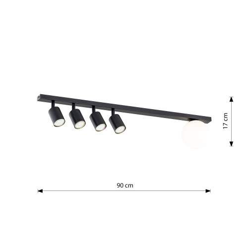 Функционален плафон с модерен дизайн от серията Baster, изработен от правоъгълна метална основа с четири подвижни цилиндрични метални глави в черен цвят на цокъл GU10 и опал стъклена сферична чашка на цокъл Е14. Оригинално предложение за осветлението във вашия хол, трапезария, спалня, коридор, офис, хотел и заведение.