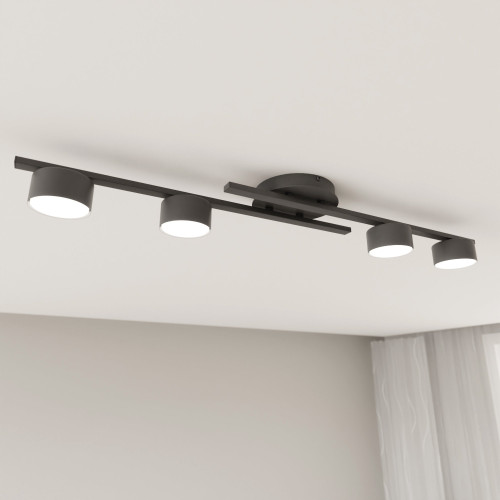 Функционален плафон с минималистичен дизайн от серията Fragment, изработен от черен цвят кръгла метална основа с две рамена и четири метални глави в черен цвят на цокъл GX53. Модерно предложение за интериорното осветление във вашия хол, трапезария, спалня, коридор, офис, хотел и заведение.