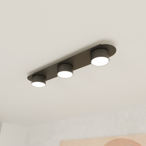Стилен плафон с минималистичен дизайн от серията Diaz, изработен от черен цвят метална основа и три метални глави в черен цвят на цокъл GX53. Функционално решение за интериорното осветление във вашия хол, трапезария, спалня, коридор, офис, хотел и заведение.